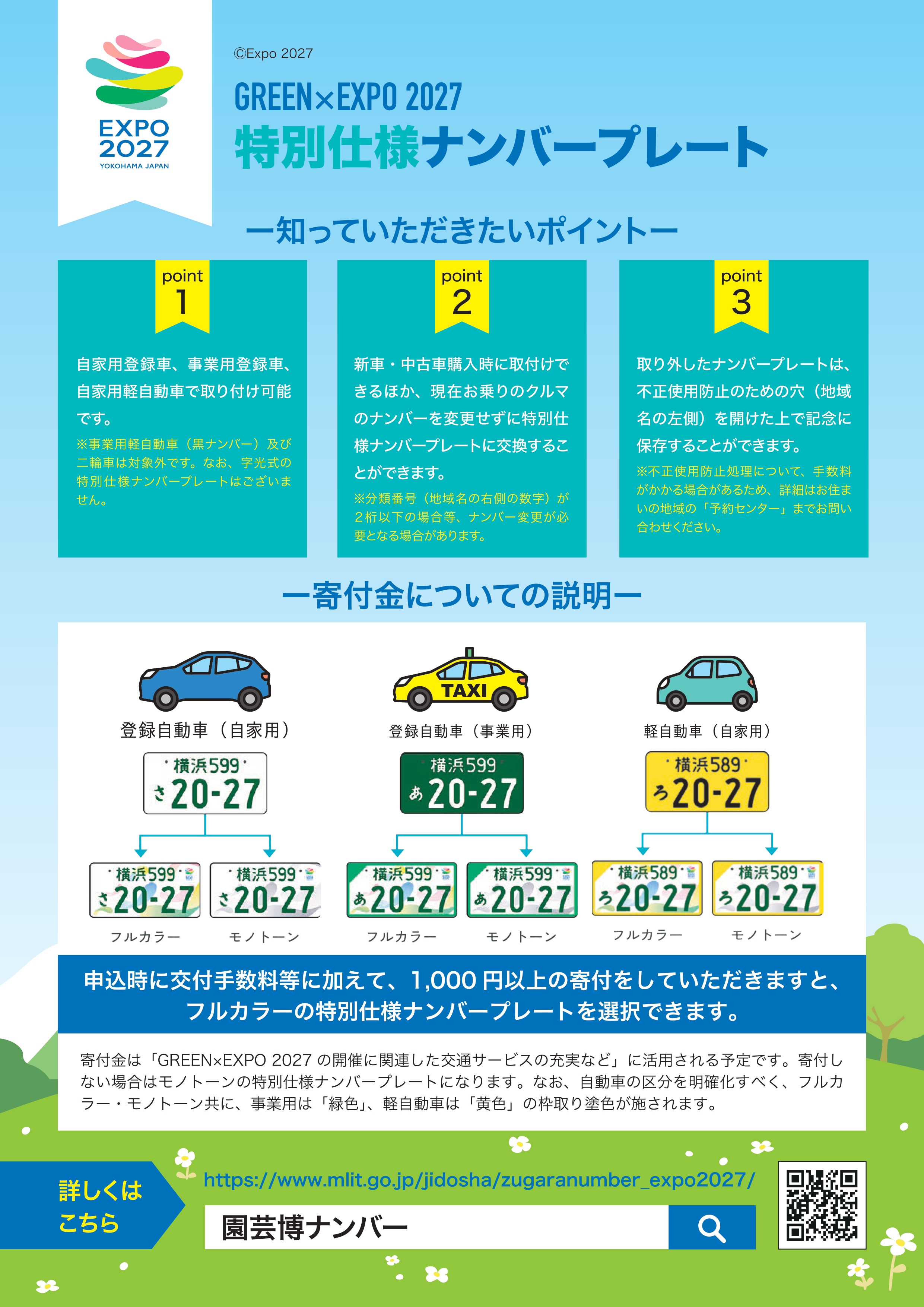 GREEN×EXPO 2027(2027年国際園芸博覧会)の開催を記念した特別仕様(図柄入り)ナンバープレートを、期間限定で全国の希望者へ交付します。申込時に交付手数料等に加えて、1,000円以上の寄付をしていただきますと、フルカラーの特別仕様ナンバープレートを選択できます。- 登録自動車(自家用)