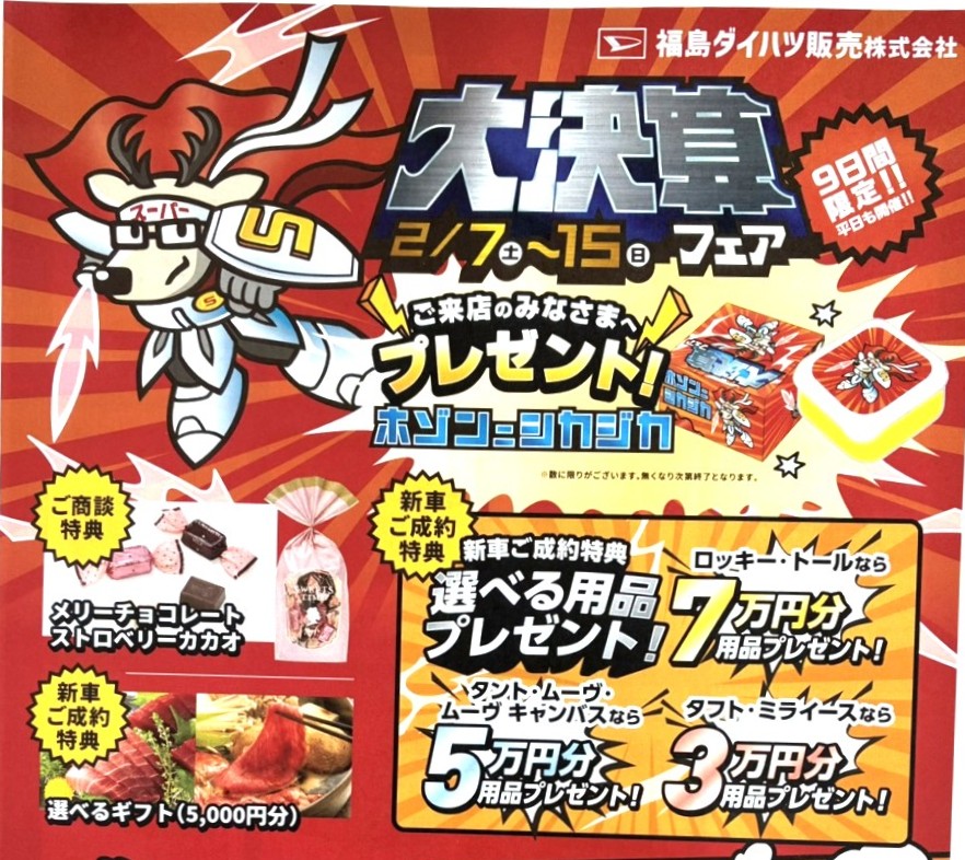 みなさ~ん!!いよいよ年度末!!大決算フェアが始まりました!! 今回は、 なっなんと!最大77000円分用品プレゼント!!(車種により異なります)